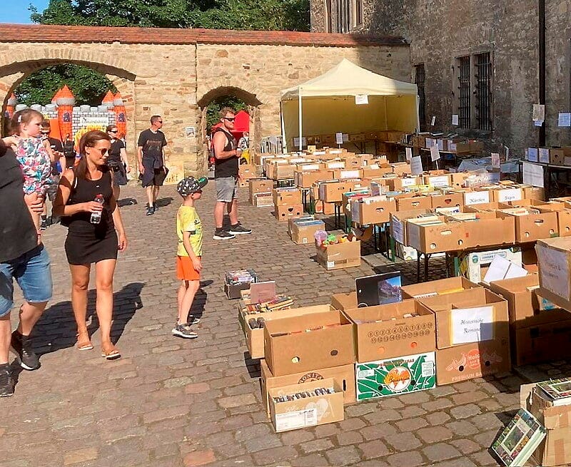 Auf zahlreichen Tischen und in Kisten präsentiert der Bücherflohmarkt ein vielfältiges Angebot: Romane, Kinder- und Jugendbücher, Sachliteratur, Bildbände, Reiseführer sowie regionale Titel wechseln hier den Besitzer. Die übersichtlich sortierten Kategorien erleichtern das Stöbern und machen den Flohmarkt zu einem entspannten Erlebnis für kleine und große Besucher.