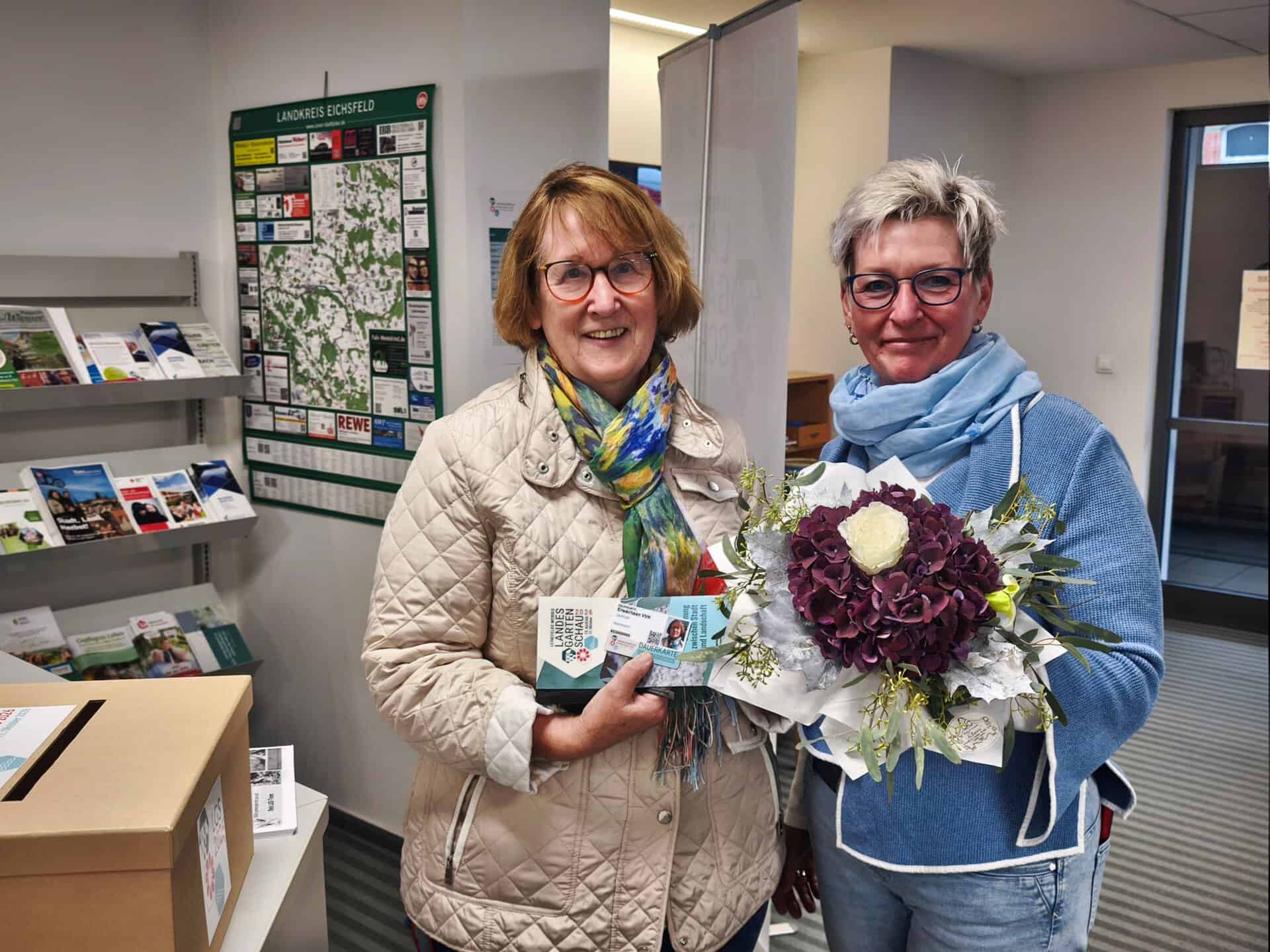 Zur feierlichen Übergabe erhielt sie von Daniela Preiß aus dem Team der Landesgartenschau einen Blumenstrauß und warme Wünsche für unvergessliche Besuche.